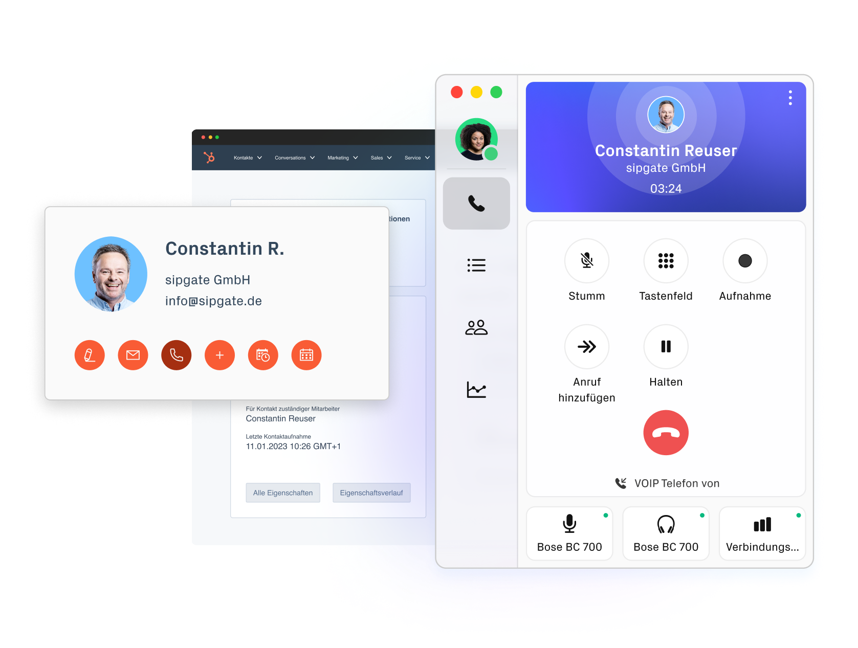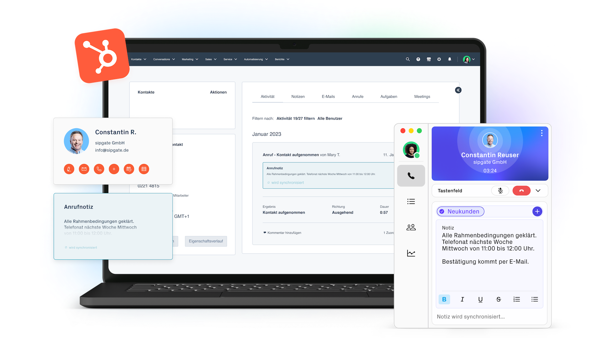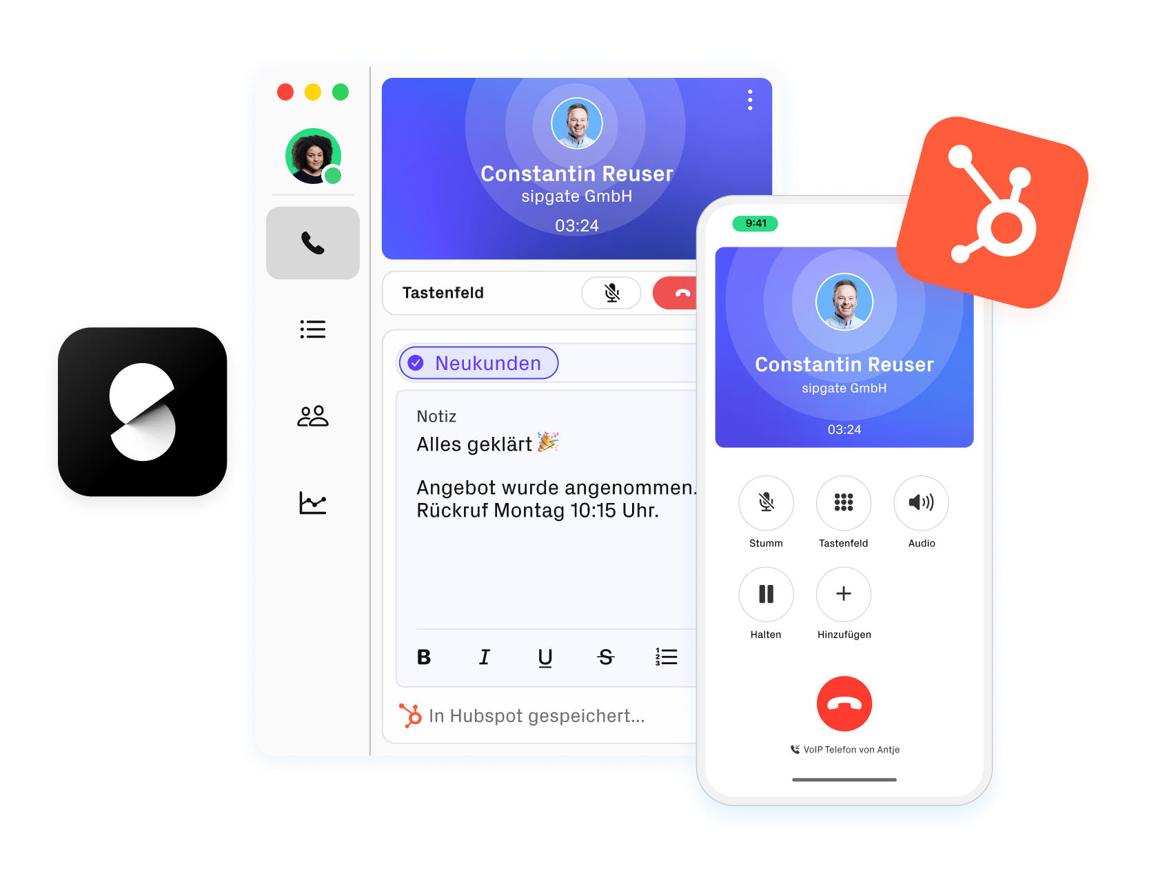 Mit der sipgate Cloud-Telefonanlage bringen Sie HubSpot das Telefonieren bei. Anrufe per Mausklick starten? Geht direkt aus HubSpot. Notizen und Anrufstatistiken? Synchronisieren sich automatisch mit Ihren HubSpot Kontakten oder Opportunities.