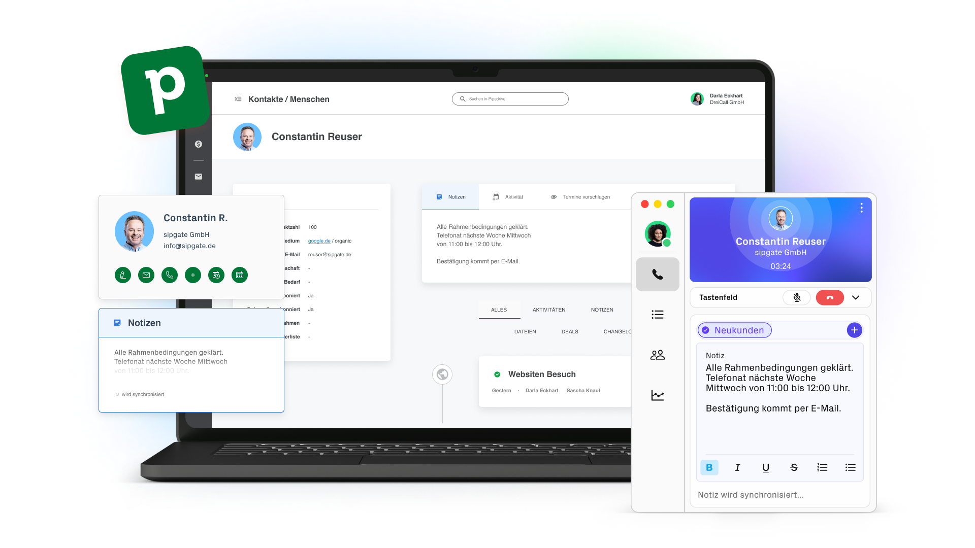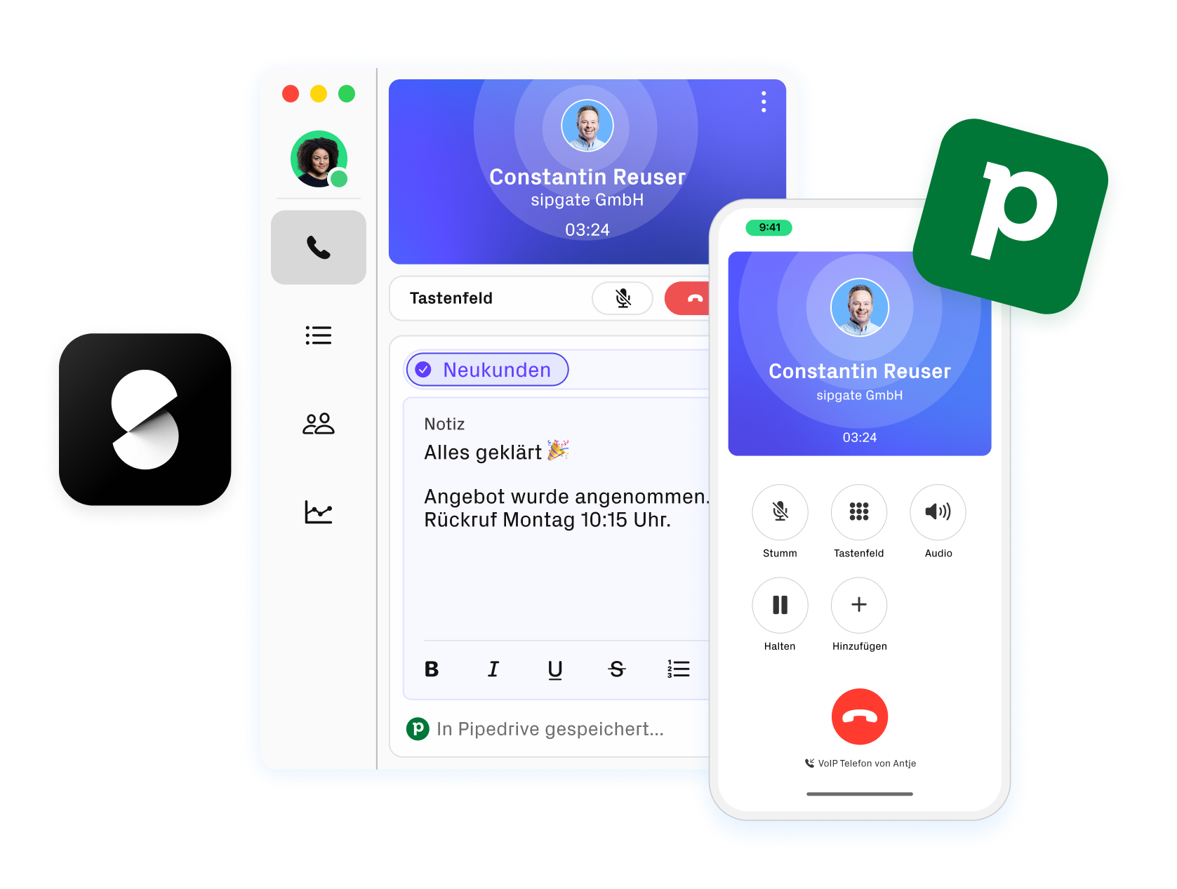 Mit der sipgate Cloud-Telefonanlage bringen Sie Pipedrive das Telefonieren bei. Anrufe per Mausklick starten? Geht direkt aus Pipedrive. Notizen und Anrufstatistiken? Synchronisieren sich automatisch mit Ihren Pipedrive Kontakten oder Opportunities.