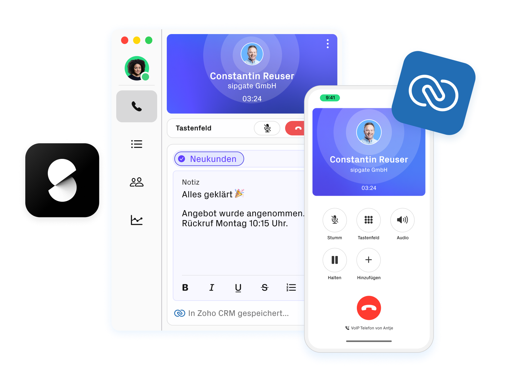 Mit der sipgate Cloud-Telefonanlage bringen Sie Zoho CRM das Telefonieren bei. Anrufe per Mausklick starten? Geht direkt aus Zoho CRM. Notizen und Anrufstatistiken? Synchronisieren sich automatisch mit Ihren Zoho CRM Kontakten oder Opportunities.